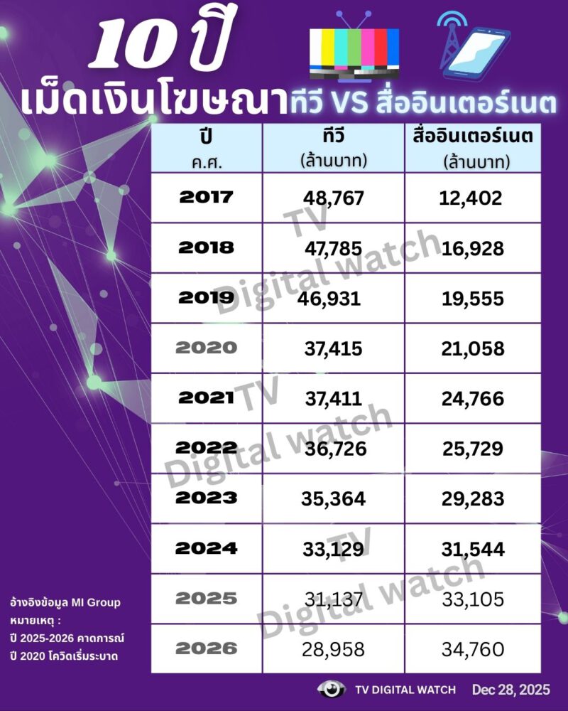 ถ้าดูรายละเอียดเพิ่มเติม โดย MI Group (Adjusted by MI Learn Lab) รวบรวมตัวเลขอ้างอิงจากแหล่งต่างๆ เช่น สมาคมโฆษณาดิจิทัลประเทศไทย พบว่าในช่วง 10 ปี ช่วง 8 ปี (2017-2024) ที่ผ่านมาที่มีช่วงการเมืองไม่นิ่ง และการระบาดของโควิด และ 2025-2026 ที่อยู่ในช่วงคาดการณ์ตัวเลข ชัดเจนว่าสื่อทีวีต้องสู้มาก เพราะตัวเลขเม็ดเงินโฆษณาลดลงเรื่อยๆ ส่วนสื่ออินเตอร์เนตนั้นเติบโตขึ้นเรื่อยๆ ดังนี้