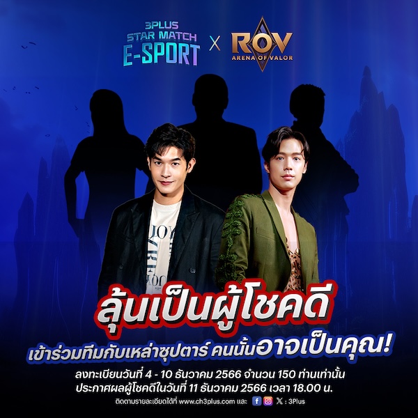 สมาชิก 3Plus Premium! สามารถส่งกำลังใจให้ซุปตาร์เกมเมอร์ในดวงใจของคุณถึงสองช่องทาง ไม่ว่าจะร่วมเชียร์แบบใกล้ชิดติดขอบสนาม โดยเปิดให้ลงทะเบียนออนไลน์ตั้งแต่วันที่ 4-10 ธันวาคม 2566 ตั้งแต่เวลา 12.00 น. จำกัดจำนวน 150 สิทธิ์ ซึ่งใน 150 คนนี้มีเพียง 10 คนเท่านั้นที่จะได้เข้าร่วมทีมกับนักแสดง นอกจากนี้แฟนๆ ที่มาร่วมงานยังมีสิทธิ์ลุ้นรับของรางวัลสุด Exclusive จาก 3Plus และ Garena ด้วย โดยประกาศผลผู้มีสิทธิ์เข้าร่วมกิจกรรมในวันที่ 11 ธันวาคม 2566 เวลา 18.00 น. ทางแฟนเพจ 3Plus และเว็บไซต์ ch3plus.com หรือรับชม Live Stream ได้ทางเว็บไซต์และแอปพลิเคชัน 3Plus ติดตามรายละเอียดเพิ่มเติม คลิก > https://ch3plus.com/special/activities/3PlusStarMatchRoV