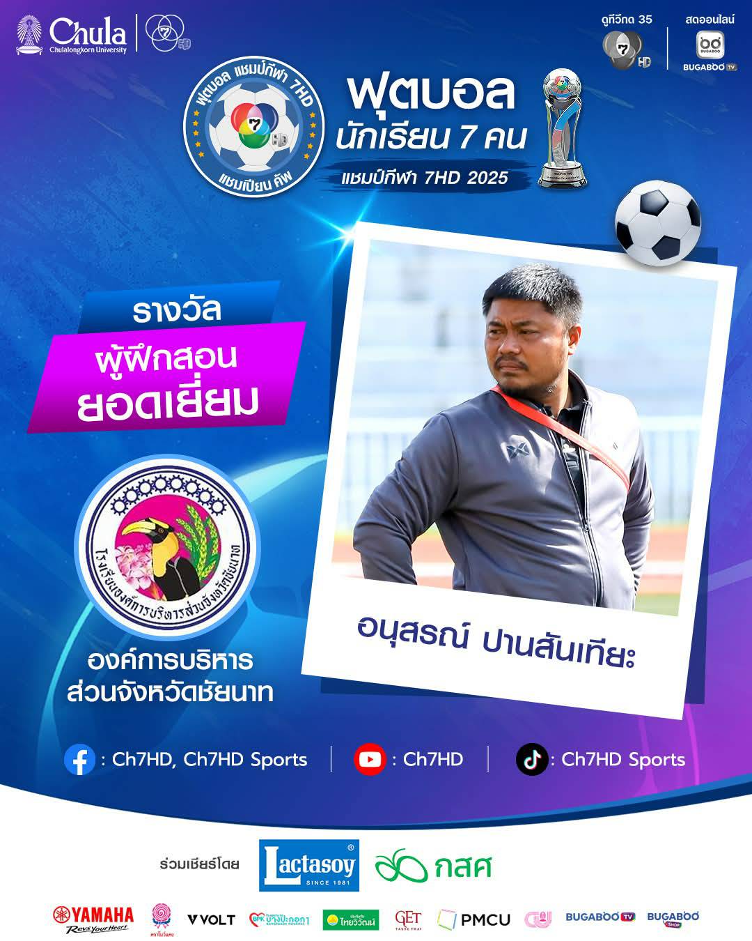 ช่อง 7HD สร้างประวัติศาสตร์หน้าใหม่ให้กับวงการกีฬาเยาวชนไทย ! ด้วยเจตนารมณ์อันแน่วแน่ในการปลุกพลังแห่งความมุ่งมั่นให้กับนักกีฬา นักเรียน เยาวชน การแข่งขันฟุตบอลนักเรียน 7 คน “แชมป์กีฬา 7HD แชมเปียน คัพ 2025” ได้รับความสนใจจากกองเชียร์ทั่วประเทศอย่างท่วมท้น คู่ชิงชนะเลิศถือเป็นการพบกันของสองทีมที่แข็งแกร่งที่สุดในทัวร์นาเมนต์ “โรงเรียนองค์การบริหารส่วนจังหวัดชัยนาท” และ “โรงเรียนหมอนทองวิทยา” ต่างงัดฟอร์มที่ดีที่สุดออกมาสู้กันอย่างสูสีและดุเดือด สร้างความประทับใจและชนะใจผู้ชมและแฟนกีฬาทั่วประเทศ โดยผลการแข่งขัน “รร.อบจ.ชัยนาท” สามารถคว้าถ้วยแชมป์เป็นสมัยแรก ขณะที่ “รร.หมอนทองวิทยา” รับตำแหน่งรองแชมป์อย่างสมศักดิ์ศรี พร้อมปรากฏการณ์ยอดชมพร้อมกันสูงสุด 4.2 ล้านคน ยอดชมทางออนไลน์ทะลุ 45 ล้านวิว รวมถึงติดเทรนด์ x อันดับ 1 #บอล7สี และยอดชมสูงสุดกีฬาในไทยทาง Facebook