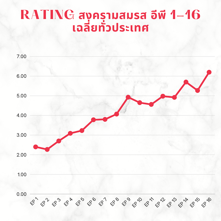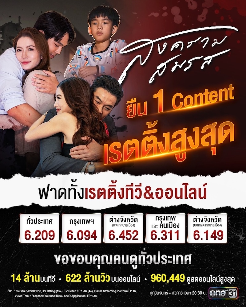 ละคร “สงครามสมรส” ช่องวัน31 ตัวจริงเรื่องความสุด สุดทุกอารมณ์ สุดทุกเรื่องราว และสุดทุกตัวละคร จนโดนใจคนไทยทั้งประเทศ โดยเฉพาะ การตีแผ่ชีวิตครอบครัวหย่าร้าง ที่สร้างผลกระทบทางจิตใจ ให้กับลูก ซึ่งสัปดาห์นี้ คู่ “แม่แอฟ ทักษอร” (บัวบงกช) และ “น้องเจ้าคุณ-พันธ์ชนกชนม์” (ปณต) ก็ยังท็อปฟอร์ม จัดดราม่า น้ำตาแตก แจกแฟนละครชุดใหญ่ ส่งให้ ช่องวัน ยืนหนึ่งคอนเท้นต์ เรตติ้งสูงสุด เรียกว่า ฟาดทั้งเรตติ้งทีวี และออนไลน์ โดยเรตติ้งล่าสุด ทั่วประเทศ : 6.209 ,กรุงเทพฯ : 6.094 ,ต่างจังหวัด (เขตเทศบาลเมือง) : 6.452 ,กรุงเทพฯ และคนเมือง : 6.311 ,ต่างจังหวัด (นอกเขตเทศบาลเมือง) : 6.149 โดยผู้ชมทางทีวี รวม 14 ล้านคน และ บนทุกช่องทางออนไลน์ รวม 622 ล้านวิว ในขณะเดียวกัน มียอดผู้ชมกว่า 960,449 คน ดูสดออนไลน์สูงสุด