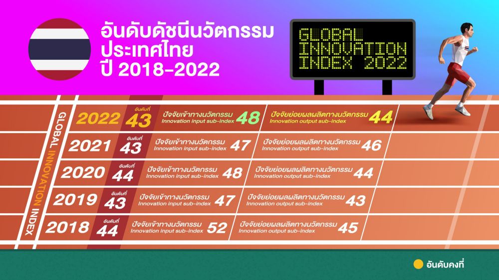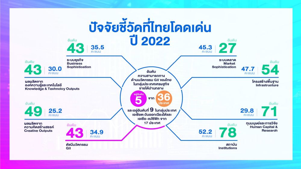 ดร. พันธุ์อาจ ชัยรัตน์ ผู้อำนวยการสำนักงานนวัตกรรมแห่งชาติ (องค์การมหาชน) กล่าวว่า การจัดอันดับ GII 2022 ภายใต้ธีมอนาคตของการเติบโตด้วยการขับเคลื่อนบนฐานนวัตกรรมคืออะไร โดยคาดการณ์ผลกระทบของนวัตกรรมใน 3 ประเด็น ได้แก่ ผลิตภาพ (Productivity) อัตราการเจริญเติบโตของเศรษฐกิจ (Economic growth) และความเป็นอยู่ที่ดีของสังคม (Well-being of society) ในทศวรรษที่กำลังจะมาถึง สำหรับผลการจัดอันดับความสามารถทางด้านนวัตกรรมในปีนี้ ประเทศไทยอยู่อันดับที่ 43 โดยในปีนี้ปัจจัยย่อยผลผลิตทางนวัตกรรม (Innovation output sub-index) อันดับที่ 44 (ดีขึ้น 2 อันดับ) ขณะที่ฝั่งปัจจัยเข้าทางนวัตกรรม (Innovation input sub-index) อันดับที่ 48 (ลดลง 1 อันดับ) แต่ยังคงอยู่ในอันดับ 5 ของกลุ่มประเทศกลุ่มรายได้ปานกลางระดับบน (Upper middle-income economies) จาก 36 ประเทศ โดยประเทศไทยมีอันดับที่ดีกว่าค่าเฉลี่ยในทุกปัจจัย เช่นเดียวกับในกลุ่มประเทศในภูมิภาคเอเชียตะวันออกเฉียงใต้ เอเชียตะวันออกและโอเชียเนีย ประเทศไทยอยู่ในอันดับ 9 จาก 17 ประเทศ