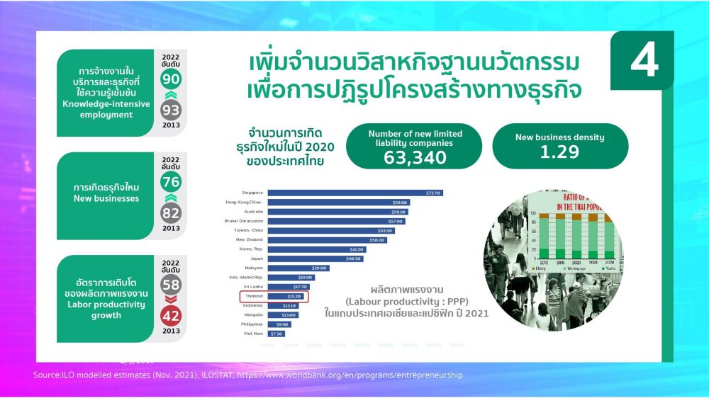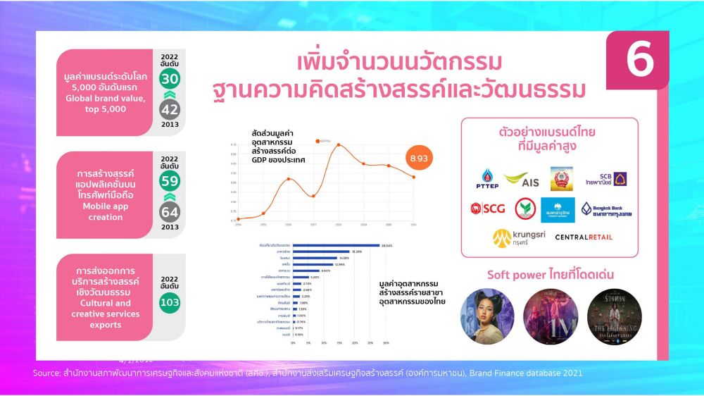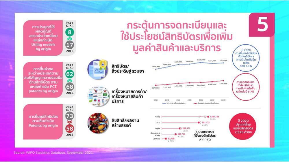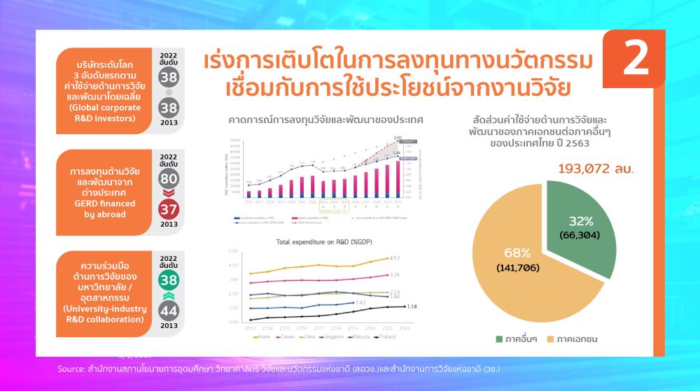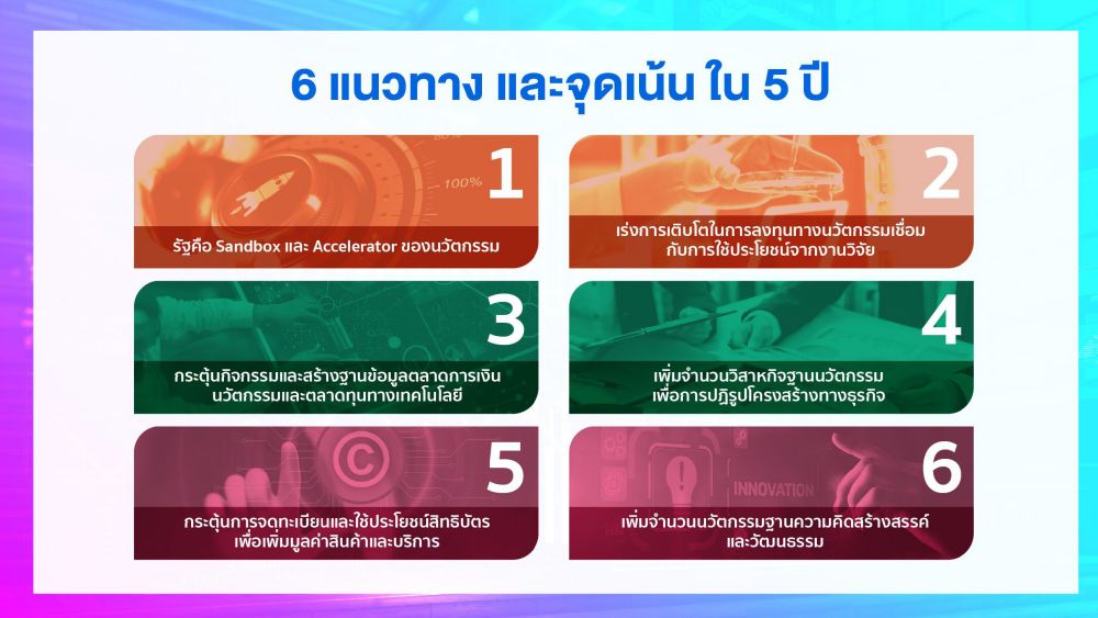 4.เพิ่มจำนวนวิสาหกิจฐานนวัตกรรมเพื่อการปฏิรูปโครงสร้างทางธุรกิจ ไปสู่ประเทศที่แข่งขันด้วยเทคโนโลยีและองค์ความรู้ รวมถึงเกิดการสร้างธุรกิจใหม่ที่ตอบสนองความเปลี่ยนแปลงของห่วงโซ่มูลค่า และเป็นการสร้างตลาดแรงงานทักษะสูงที่ใช้ความรู้เข้มข้นเพื่อดึงดูดบุคลากรที่มีศักยภาพมาสร้างความสามารถในการแข่งขันให้กับธุรกิจ อุตสาหกรรม และบริการ 5.กระตุ้นการจดทะเบียนสิทธิบัตรและใช้ประโยชน์สิทธิบัตรเพื่อเพิ่มมูลค่าสินค้าและบริการ ประเทศไทยมีการยื่นจดผลิตภัณฑ์อรรถประโยชน์ หรืออนุสิทธิบัตรสูงเป็นอันดับ 8 ของโลก แต่นวัตกรรมที่เกิดขึ้นเป็นแบบค่อยเป็นค่อยไป ระดับการพัฒนาเทคโนโลยีไม่สูงมากนัก จึงต้องพัฒนานโยบายเชิงรุกด้านการลงทุนและการคุ้มครองสิทธิในทรัพย์สินทางปัญญา เพื่อนำไปสู่การสร้างองค์ความรู้ใหม่ในประเทศ และจะช่วยปรับปรุงการเข้าถึงความรู้และเทคโนโลยีทั้งในประเทศและระดับโลก รวมถึงการสร้างระบบนิเวศนวัตกรรมที่เอื้อต่อการกระตุ้นการเติบโตของทรัพย์สินทางปัญญาทั้งในเชิงของโครงสร้างพื้นฐาน ระบบการคุ้มครอง การจดทะเบียนความสะดวกรวดเร็ว และ 6. เพิ่มจำนวนนวัตกรรมฐานความคิดสร้างสรรค์และวัฒนธรรม ซึ่งถือเป็นทรัพยากรที่สามารถนำไปสู่นวัตกรรมที่หลากหลาย สามารถสอดแทรกไปในหลายอุตสาหกรรม เช่น ท่องเที่ยว อาหาร แฟชั่น บันเทิง ฯลฯ ทั้งนี้ การนำพลังอำนาจอ่อน (Soft Power) มาพัฒนาอุตสาหกรรมและทำให้เกิดการสร้างแบรด์ระดับโลกมีปรากฏให้เห็นในหลายประเทศ ซึ่งประเทศไทยมีจุดเด่นด้านทุนทางวัฒนธรรมที่มีเอกลักษณ์ หลากหลายและเป็นที่รับรู้ในเวทีสากล แต่การส่งเสริมและการใช้เครื่องทางการสื่อสารและการตลาดมาสนับสนุนการรับรู้และการเติบโตในเวทีสากลยังมีอยู่จำกัด จึงจำเป็นต้องใช้ประโยชน์เครื่องมือเหล่านี้เพื่อผลักดันการสร้างอัตลักษณ์และแบรนด์ดิ้งนวัตกรรมไทยไปสู่สากล