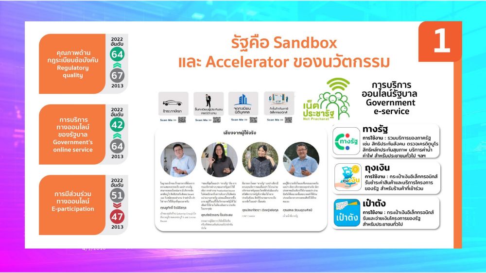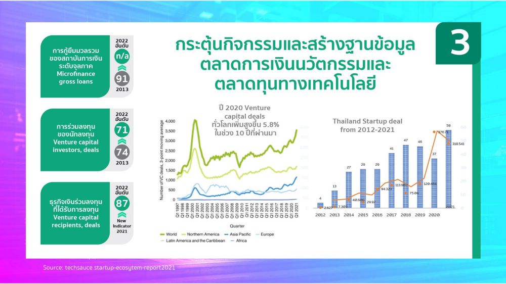 ดร.พันธุ์อาจ กล่าวเพิ่มเติมว่า ผลการจัดอันดับและตัวชี้วัดเหล่านี้สะท้อนว่า หลายปีที่ผ่านมาทุกภาคส่วนของประเทศไทยทั้งภาครัฐ การศึกษา เอกชน และประชาชน พยายามยกระดับความสามารถทางนวัตกรรมเพื่อรับมือกับความเปลี่ยนแปลงที่เกิดขึ้นอย่างต่อเนื่อง โดยระยะสั้นประเทศต้องเร่งขับเคลื่อนใน 6 แนวทางสำคัญ ได้แก่ 1. รัฐคือ Sandbox และ Accelerator ของนวัตกรรม เพื่อให้เกิดพื้นที่นำร่องและสร้างความเปลี่ยนแปลงด้วยนวัตกรรม รวมถึงยกระดับการบริการภาครัฐและเปิดโอกาสให้ประชาชนมีส่วนร่วมในการพัฒนาด้วยเทคโนโลยีดิจิทัล ปรับเปลี่ยนบทบาทภาครัฐจากผู้ควบคุม กำกับ เป็นผู้ส่งเสริมและผลักดันให้ประเทศมีความสามารถทางด้านนวัตกรรม 2.เร่งการเติบโตในการลงทุนทางนวัตกรรมเชื่อมกับการใช้ประโยชน์จากงานวิจัย โดยเฉพาะในภาคเอกชนไทยที่มีสัดส่วนการลงทุนสูงกว่าหน่วยงานภาครัฐอย่างโดดเด่น ดังนั้น หากเร่งส่งเสริมให้เกิดความร่วมมือระหว่างภาคการศึกษาและภาคอุตสาหกรรมจะช่วยเร่งการเติบโต การใช้ประโยชน์ การลงทุน และการถ่ายทอดองค์ความรู้ด้านวิจัยและพัฒนาจากต่างประเทศ เพื่อสร้างผลผลิตทางนวัตกรรมที่ตอบโจทย์ความต้องการของตลาดโลก 3.กระตุ้นกิจกรรมและสร้างฐานข้อมูลตลาดการเงินนวัตกรรมและตลาดทุนทางเทคโนโลยี โดยสร้างความเข้มแข็งให้กับตลาดธุรกิจเงินร่วมลงทุน ระบบการร่วมลงทุนที่ยอมรับความเสี่ยงในการพัฒนานวัตกรรมของภาคเอกชน และลดความเสี่ยงสำหรับการลงทุนในระยะเริ่มต้น พร้อมทั้งสร้างโอกาสการเข้าถึงแหล่งเงินทุนแก่ธุรกิจที่ดำเนินการวิจัยและพัฒนา นวัตกรรมผ่านสถาบันการเงินไมโครไฟแนนซ์