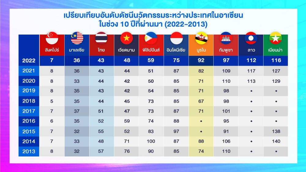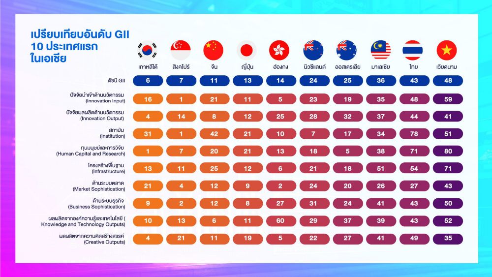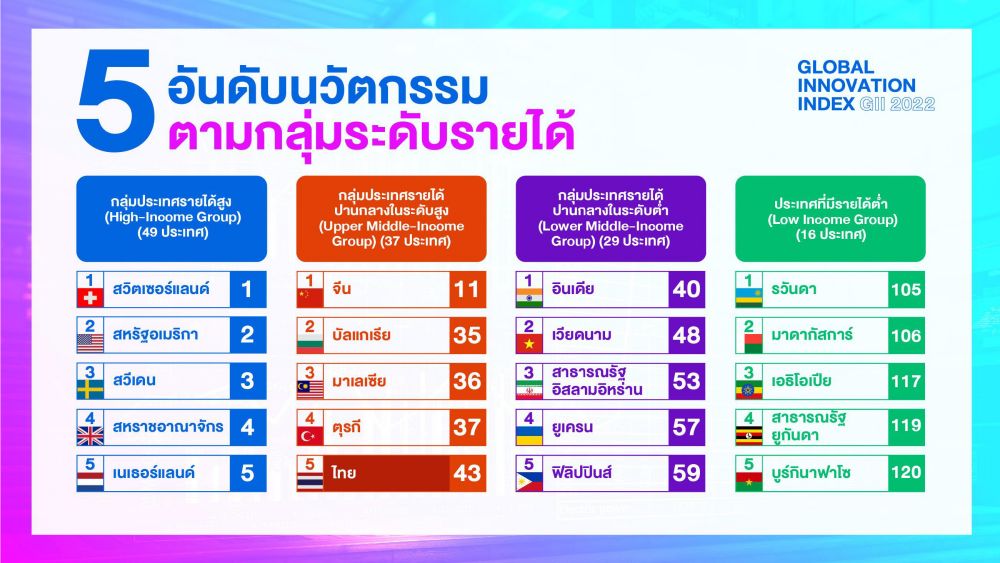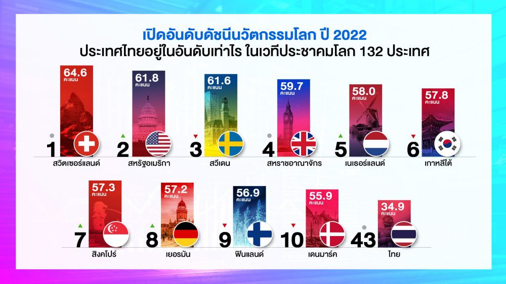 กรุงเทพฯ 30 กันยายน 2565 – สำนักงานนวัตกรรมแห่งชาติ (องค์กรมหาชน) หรือ NIA เผยผลการจัดอันดับดัชนีนวัตกรรมโลก ประจำปี 2565 (Global Innovation Index 2022; GII 2022) ภายใต้ธีมอนาคตของการเติบโตด้วยการขับเคลื่อนบนฐานนวัตกรรมคืออะไร (What is the future of innovation-driven growth?) ซึ่งจัดโดยองค์การทรัพย์สินทางปัญญาแห่งโลก (WIPO) เพื่อวัดระดับความสามารถทางด้านนวัตกรรม ที่เป็นเสมือนมาตรวัดเปรียบเทียบเชิงเวลาและการเปรียบเทียบเชิงแข่งขันทางด้านนวัตกรรมของแต่ละประเทศกว่า 130 ประเทศทั่วโลก โดยในปีนี้ประเทศไทยยังครองอันดับที่ 43 (ปี 2021 อันดับ 43) ถือเป็นอันดับ 3 ในอาเซียนรองจากสิงคโปร์ อันดับ 7 และมาเลเซีย อันดับ 36 โดยปัจจัยสัดส่วนค่าใช้จ่ายมวลรวมด้านวิจัยและพัฒนาที่ลงทุนโดยองค์กรธุรกิจ และปัจจัยสัดส่วนการส่งออกสินค้าสร้างสรรค์เป็นอันดับ 1 ของโลก สำหรับปีนี้สาธารณรัฐสังคมนิยมเวียดนามอยู่ในอันดับ 48