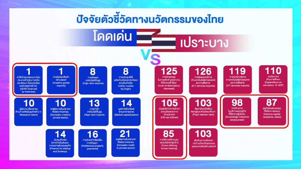 อย่างไรก็ตามปัจจัยที่ควรต้องให้ความสำคัญเพิ่มขึ้น ได้แก่ ปัจจัยด้านสถาบัน ที่ภาพรวมอันดับลดลงถึง 14 อันดับ (อันดับที่ 78) ปัจจัยด้านทุนมนุษย์และการวิจัย ภาพรวมอันดับลดลง 8 อันดับ แต่ยังมีตัวชี้วัดด้านการวิจัยและพัฒนา (R&D) ของประเทศที่อันดับดีขึ้นอย่างต่อเนื่อง โดยเฉพาะสัดส่วนค่าใช้จ่ายมวลรวมภายในประเทศสำหรับการวิจัยและพัฒนา อยู่อันดับที่ 36 ซึ่งเป็นจุดแข็งของประเทศไทยในระดับกลุ่มประเทศรายได้ปานกลางระดับบน ปัจจัยด้านระบบตลาด ที่แม้ภาพรวมยังคงเดิมในอันดับที่ 27 แต่มีตัวชี้วัดที่เกี่ยวข้องกับข้อตกลงธุรกิจเงินร่วมลงทุนที่ได้รับการลงทุนเป็นจุดอ่อนของประเทศ อยู่อันดับที่ 87 และปัจจัยด้านผลผลิตจากองค์ความรู้และเทคโนโลยี ภาพรวมอันดับลดลง 3 อันดับ (อันดับที่ 43)