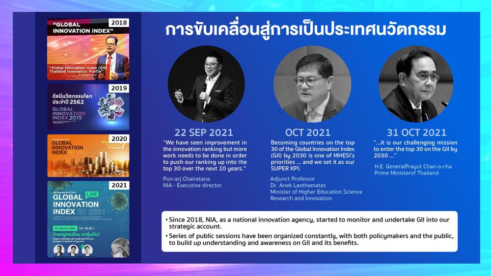 การพัฒนาที่สอดรับและสนับสนุนให้ตรงกับปัจจัยและตัวชี้วัดที่เป็นข้อจำกัดเชิงระบบ จะช่วยให้ประเทศไทยสามารถก้าวกระโดดเป็นประเทศชั้นนำที่ขับเคลื่อนด้วยนวัตกรรม NIA ในฐานะหน่วยประสานและขับเคลื่อนระบบนวัตกรรมของประเทศ จึงให้ความสำคัญกับการติดตามและนำข้อมูลดัชนีนวัตกรรมโลกมาใช้ประโยชน์ในการประสานความร่วมมือกับหน่วยงานต่างๆ ที่เกี่ยวข้อง เพื่อให้เกิดการออกแบบนโยบายที่เหมาะสมและสอดคล้อง สามารถขับเคลื่อนและปรับเปลี่ยนระบบนวัตกรรมไทยได้อย่างตรงจุดและมีประสิทธิภาพ