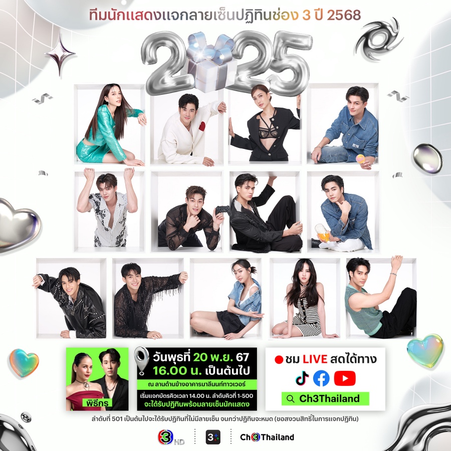 เริ่มแล้ว ช่วงเวลาส่งมอบของขวัญปีใหม่จากใจ ช่อง 3 กับปฏิทินปี ‘68’ พร้อมลายเซ็นนักแสดง สุดฮอต สุดปัง! ในธีม “New Energy” ส่งความสุขตอบแทนน้ำใจ คืนกำไรให้สู่แฟน ๆ ช่อง 3 หลังจากมีการปล่อยภาพเบื้องหลังการถ่ายปฏิทินปี ‘68’ ไปแล้ว จนกลายเป็นกระแสร้อนแรง และเป็นปฏิทินชุดใหม่ไฟกะพริบที่ทุกคนรอคอย ซึ่ง ช่อง 3 พร้อมมอบให้เป็นของขวัญปีใหม่กันฟรี ๆ หนึ่งปีมีหนึ่งครั้ง โดยชวนแฟน ๆ มาร่วมกระทบไหล่กับเหล่านักแสดง สุดฮอต! สุดปัง! กว่า 50 ชีวิต ที่จะทยอยมามอบลายเซ็น เตรียมตัว เตรียมใจ เตรียมป้ายไฟ แล้วมารับบัตรคิวกันรัว ๆ