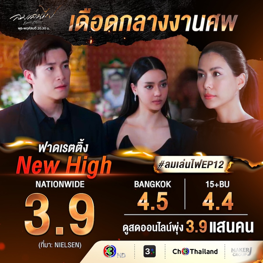 “ลมเล่นไฟ”  ในอีพี12  ทำเรตติ้งทั่วประเทศได้ 3.9 สำหรับกลุ่มผู้ชมกรุงเทพฯ สูงสุด 4.5 ส่วนเรตติ้งกลุ่มผู้ชมอายุ 15 ปี ขึ้นไป หรือ กลุ่ม 15 BU+ (Bangkok and Urban) พุ่งแรงถึง 4.4 แฟน ๆ พร้อมใจกันเตือนเฟลมว่าไม่ควรยัดความคิดแบบผิด ๆ ให้แก่เด็ก เพราะเด็กเหมือนผ้าขาว แถมดินยังไม่ยอมเตือนอีก จะเป็นพ่อที่ดีกี่โมงกันเอ่ย? ฟากอีพี13 ก็ไม่น้อยหน้าเจอความสัมพันธ์อันยุ่งเหยิงของดิน-พระพายเข้าไปแฟนละครถึงขนาดกุมขมับเลยคว้าเรตติ้งกลุ่มผู้ชมกรุงเทพฯ ไปถึง 4.3 ส่วนเรตติ้งกลุ่มผู้ชมอายุ 15 ปี ขึ้นไป หรือ กลุ่ม 15 BU+ (Bangkok and Urban) ทำได้ 4.2 และเรตติ้งทั่วประเทศทำได้ 3.6