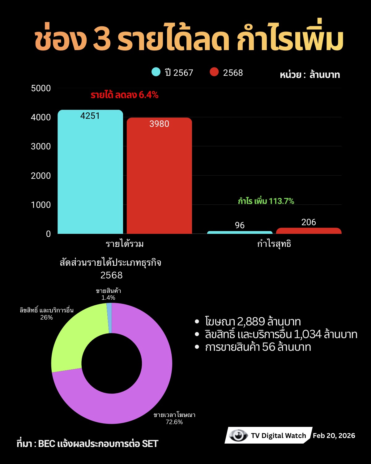 สรุปผลออกมาแล้ว รายได้ และกำไรของช่อง 3 ภายใต้ บริษัท บีอีซีเวิลด์ จำกัด (มหาชน) หรือ BEC ปี 2568 มีรายได้รวม 3,979.7 ล้านบาท และกำไรสุทธิ 205.8 ล้านบาท ตามที่รายงานตลาดหลักทรัพย์แห่งประเทศไทย ล่าสุดวันที่ 20 กุมภาพันธ์ 2569 โดยมีคอนเทนต์เด่นในส่วนรายการทีวีอย่างเช่น ละครเรื่อง แม่เลี้ยง คุณพี่เจ้าขา ดิฉันเป็นด่านไม่ใช่หงส์ ใจขังเจ้า โดยรายได้จากโฆษณา ซึ่งเป็นสัดส่วนรายได้สูงสุดของช่อง 3 นั้นลดลงจากปีที่แล้วถึง 16% แต่มีรายได้อื่นอย่างลิขสิทธิ์ และบริการอื่น อย่างการบริหารศิลปิน การออกส่งซีรีส์ ละครไปต่างประเทศ และการขายสินค้า รวมถึงภาพยนตร์ อย่างธนาหยด ที่ได้ผลตอบรับดี ทำให้ชดเชยรายได้โฆษณาทีวีที่ลดลง