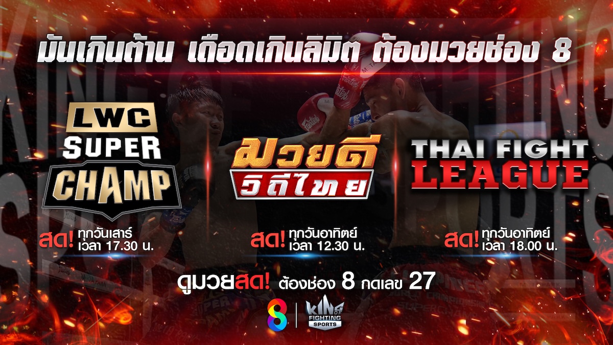 ดังนั้นห้ามพลาดชม 3 รายการมวยไทยสุดสัปดาห์ การันตีความมันส์ที่สุดระดับประเทศ ในรายการ LWC SUPER CHAMP (ลุมพินีเวิลด์ แชมเปี้ยนชิพ ซุปเปอร์แชมป์) ในวันเสาร์ที่15 พฤศจิกายน เวลา 17.30 น. และ 2 รายการสุดมันส์ในวันอาทิตย์ที่ 16 พฤศจิกายน กับรายการ มวยดีวิถีไทย เวลา 12.30 น. และ รายการ THAI FIGHT LEAGUE เวลา 18.00 น. ทางช่อง 8 กดเลข 27 ที่มีรายการมวยไทยมากที่สุด!
