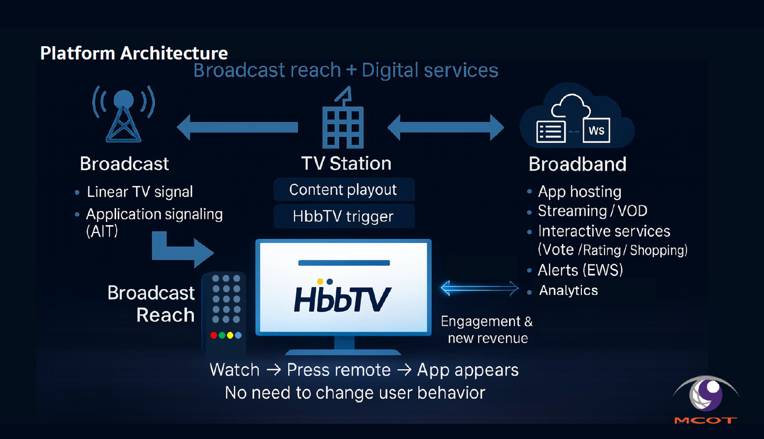 สรุปเทคโนโลยี HbbTV คือเป็นเทคโนโลยีการส่งสัญญาณโทรทัศน์ดิจิทัลภาคพื้นดิน (DVB-T2) ในปัจจุบันผสมผสานเข้ากับระบบเครือข่ายอินเทอร์เน็ตความเร็วสูงช่วยให้ผู้ชมสามารถโต้ตอบกับหน้าจอทีวีดิจิทัลได้ (Interactive TV) ผู้ชมยังสามารถสั่งซื้อสินค้าที่ปรากฏในรายการหรือโฆษณาบนทีวีดิจิทัลได้ทันทีผ่านรีโมทคอนโทรล การทำโหวต  ที่สำคัญระบบ HbbTV ยังสามารถเก็บรวบรวมข้อมูลพฤติกรรมการรับชมเชิงลึกที่เป็นปัจจุบัน ทำให้ทีวีดิจิทัลสามารถวิเคราะห์ข้อมูล (Insight) ได้อย่างเป็นระบบ เพื่อใช้ในการพัฒนาเนื้อหาคุณภาพรายการที่ตอบสนองผู้ชมได้ดียิ่งขึ้น