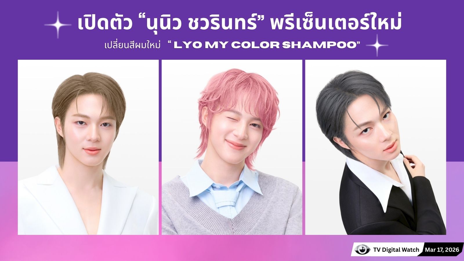 สร้างความฮือฮาให้วงการพรีเซนเตอร์อีกครั้ง เมื่อ “นุนิว ชวรินทร์” (NuNew) ศิลปินหนุ่มขวัญใจแฟน ๆ ได้รับการเปิดตัวเป็นพรีเซนเตอร์คนใหม่ของแบรนด์ LYO (ไลโอ) ภายใต้การบริหารของ “หนุ่ม กรรชัย กำเนิดพลอย” สำหรับผลิตภัณฑ์ LYO MY COLOR แชมพูเปลี่ยนสีผม ที่กำลังเดินหน้าทำตลาดอย่างต่อเนื่องในปี 2569