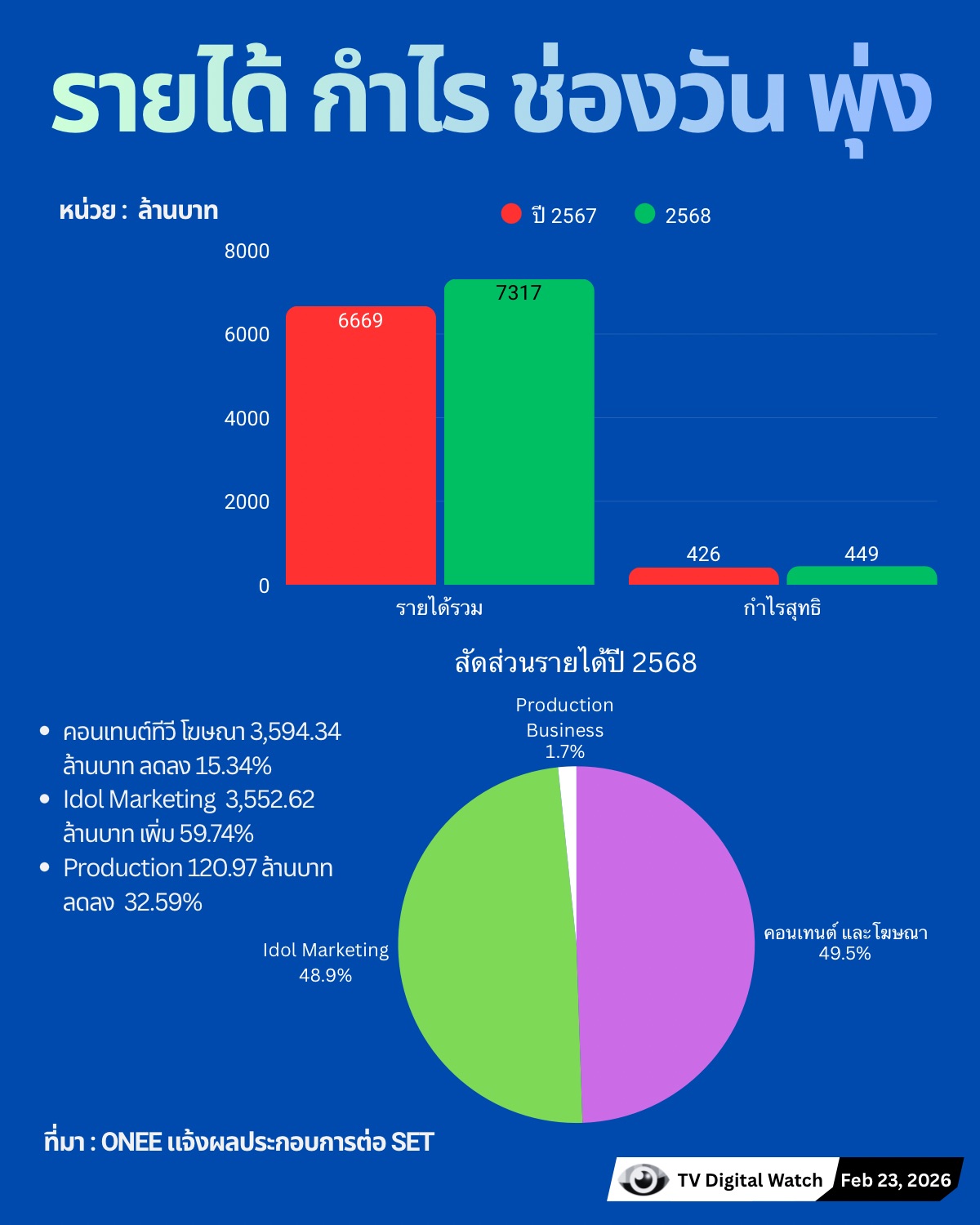 บริษัท เดอะ วัน เอ็นเตอร์ไพรส์ จำกัด (มหาชน) (ONEE) เจ้าของช่องวัน 31 แจ้งผลประกอบการปี 2568 ทั้งรายได้และกำไรเพิ่มขึ้นเมื่อเปรียบเทียบกับปีที่แล้ว แม้รายได้จากโฆษณาจะลดลง แต่มีรายได้อื่นเพิ่มขึ้น คือรายได้จากธุรกิจบริหารศิลปิน ที่มีสัดส่วนรายได้เกือบเท่ากับรายได้จากคอนเทนต์มาร์เก็ตติ้งที่มาจากโฆษณา