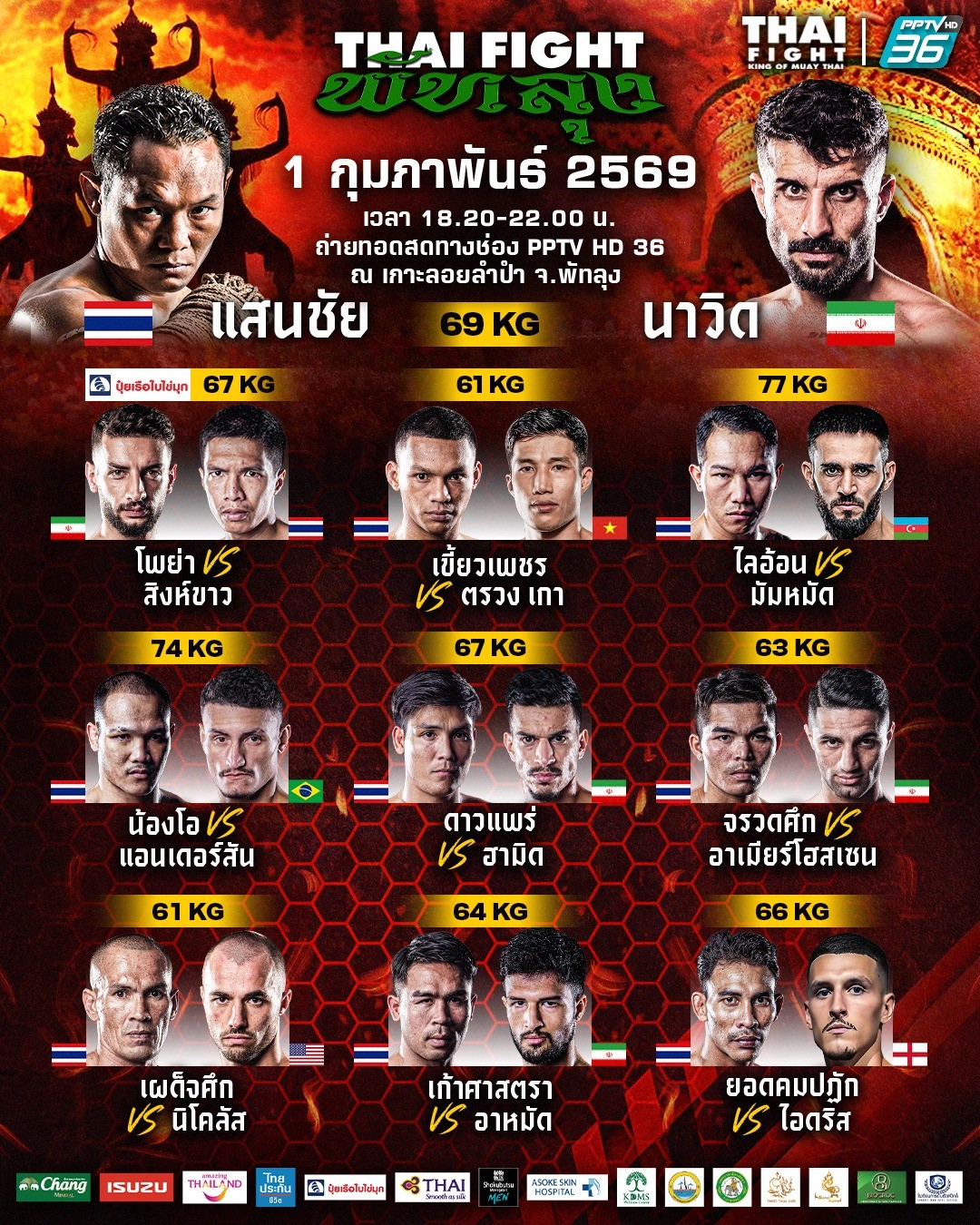 ศึก THAI FIGHT พัทลุง ครั้งนี้ อัดแน่นด้วยไฮไลต์ระดับตัวท็อป เมื่อยอดนักมวยแถวหน้าของประเทศ พร้อมใจกันขึ้นสังเวียนให้ แฟนมวยได้ชมกันแบบจัดหนัก นำโดย แสนชัย ราชันมวยไทยผู้เป็ นตำนาน กับลีลาแม่ไม้มวยไทยสุดเหนือชั้ นที่สะกดทุกสายตา เตรียมขึ้นชกพบกับ นาวิด อาลี นักชกชาวอิหร่าน ในพิกัดน้ำหนัก 69 กิโลกรัม