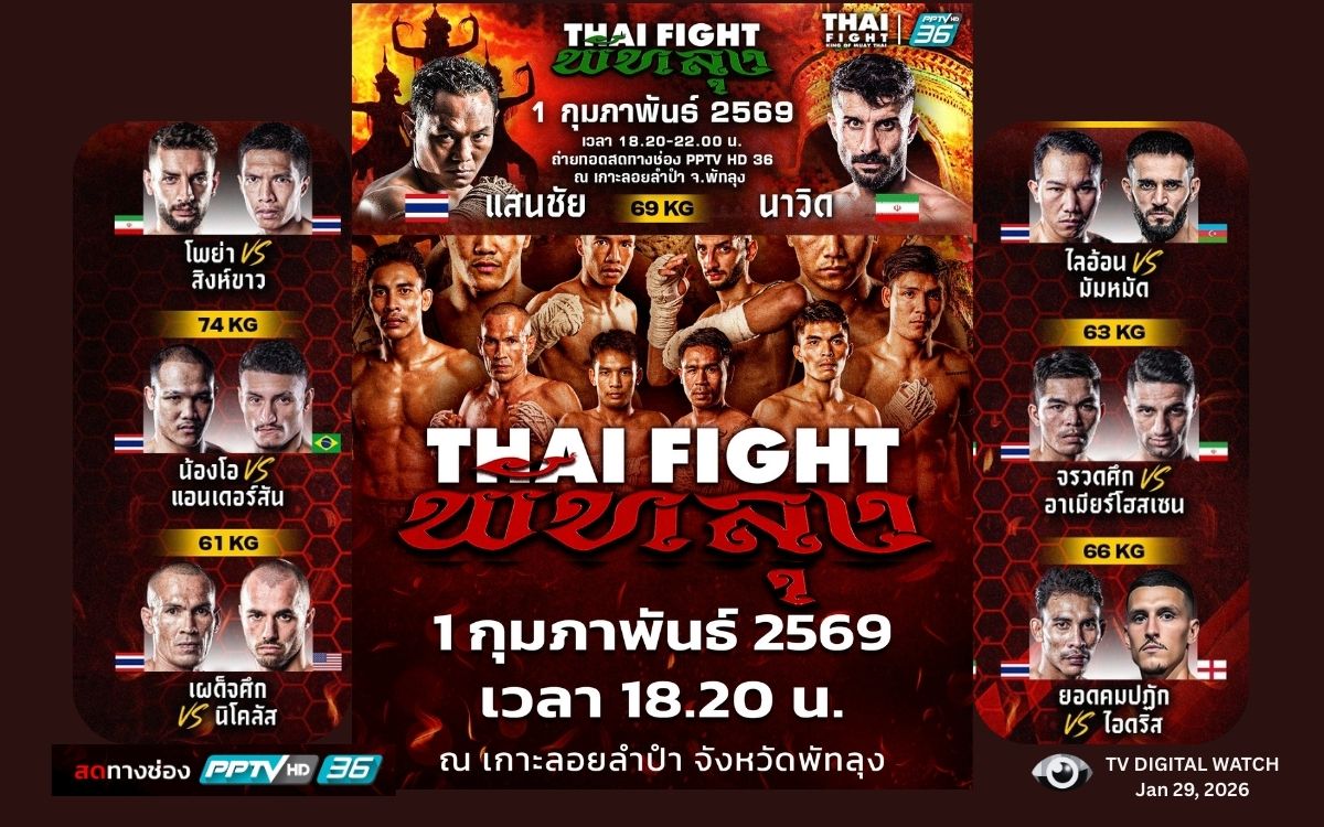 พีพีทีวี เอชดี ช่อง 36 เตรียมถ่ายทอดสด! ศึกสังเวียนเดือดไฟท์ใหญ่ครั้ งแรกของปี 2569 “THAI FIGHT พัทลุง” ยกทัพเหล่าขุนพลแถวหน้ าดีกรีแชมป์ถ้วยพระราชทาน ที่จะบุกสร้างปรากฏการณ์ถึงถิ่ นโนรา ณ เกาะลอยลำปำ จังหวัดพัทลุง ในวันอาทิตย์ที่ 1 กุมภาพันธ์ นี้ ตั้งแต่เวลา 18.20 เป็นต้นไป