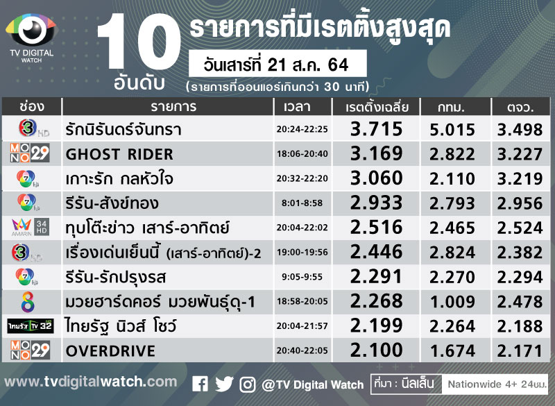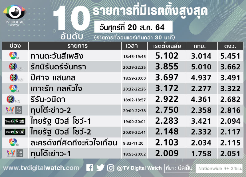 ในสัปดาห์นี้ ทุกช่องอยู่ในอันดับเดิมทั้งหมด โดยมีช่อง 7 อันดับ 1 เรตติ้งเฉลี่ย 1.374 ดีขึ้นจาก 1.310 ในสัปดาห์ก่อนหน้า มีละครค่ำ “ทานตะวันสีเพลิง” เข้าใกล้จบเรตติ้งดีต่อเนื่อง วันศุกร์ที่ 20 ส.ค.เรตติ้ง 5.102 ส่วนละครปลายสัปดาห์ “เกาะรัก กลหัวใจ” เรตติ้ง 3.172 3.060 และ 2.836 เท่านั้น ละครรีรันพื้นบ้าน “สังข์ทอง” เรตติ้ง 2.933 และ 2.766 รายการวาไรตี้เกมโชว์ “มาสเตอร์เชฟ ประเทศไทย ทีมชาเลนจ์ สเปเชียล” เรตติ้ง 1.680