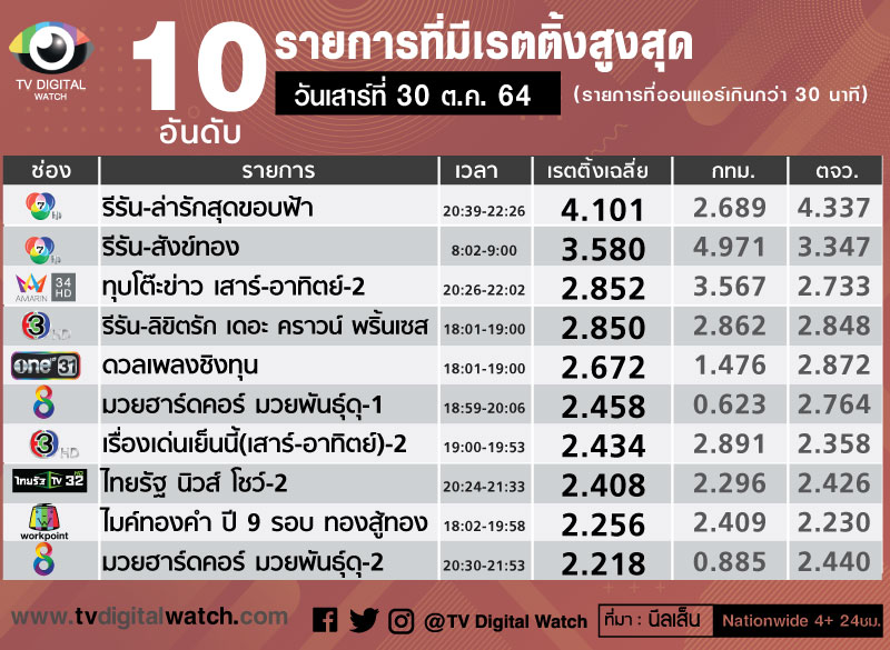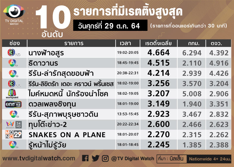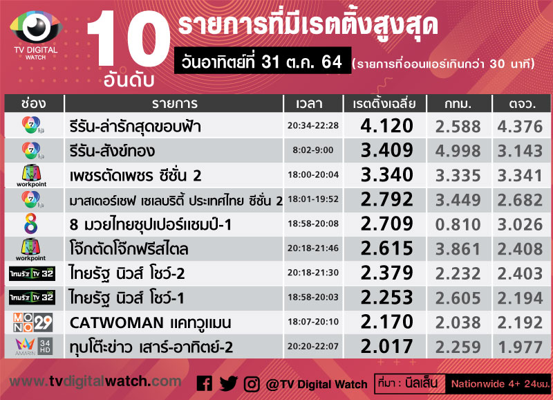 เรตติ้งประจำสัปดาห์ 25-31 ต.ค.64 สัปดาห์นี้พบว่ามีเพียง 3 ช่องที่ผลงานดีขึ้นได้รับความนิยมสูงขึ้นเมื่อเทียบกับสัปดาห์ก่อนหน้า ได้แก่ ช่อง One ช่อง True4U และช่อง 5 ในขณะที่ช่องที่เหลืออีก 15 ช่องเรตติ้งเฉลี่ยช่องลดลงหมด