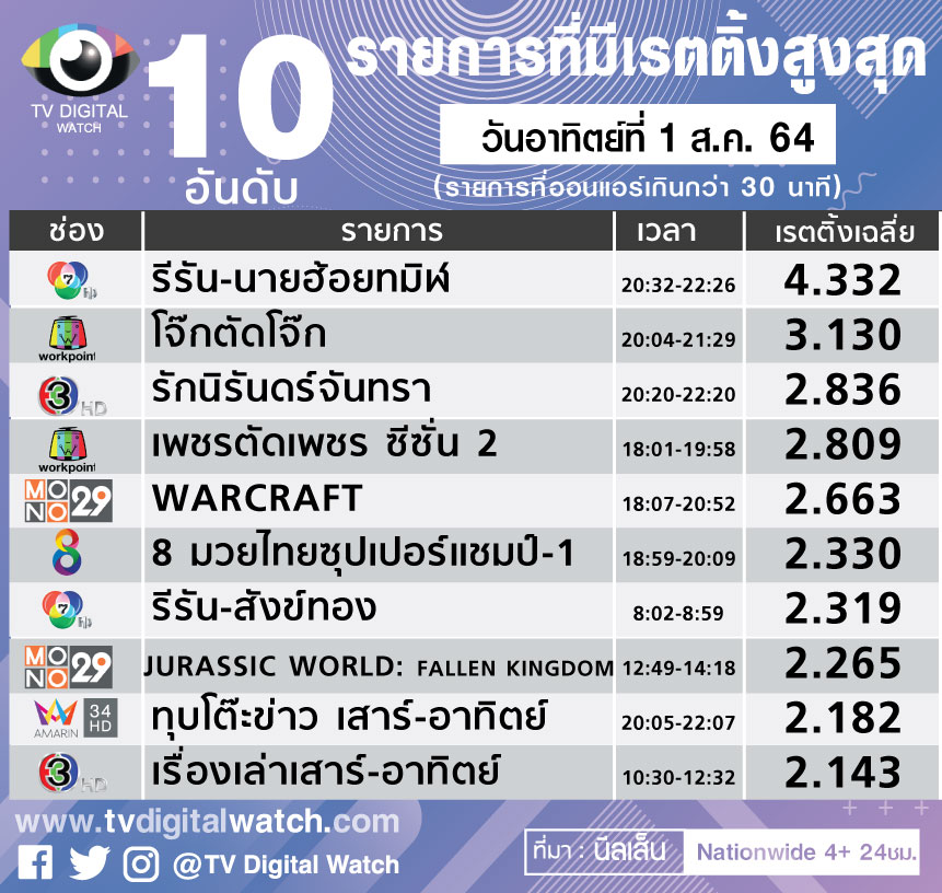 เรตติ้งประจำสัปดาห์ที่ 26 ก.ค.-1 ส.ค.2564 สัปดาห์ของการแข่งขันกีฬาโอลิมปิก รายการเด่นของกีฬาโอลิมปิกสัปดาห์นี้เป็นการแข่งขันแบดมินตัน หญิงเดี่ยว แมตช์ที่ “รัชนก อินทนนท์” แพ้ ไต้จื่ออิง ชาวไต้หวัน เป็นแมตช์ที่ผู้ชมสนใจมากแมตช์หนึ่ง ถ่ายทอดสดทางช่องไทยพีบีเอส และช่อง GMM 25 เรตติ้ง 1.032 และ 0.931 ตามลำดับ