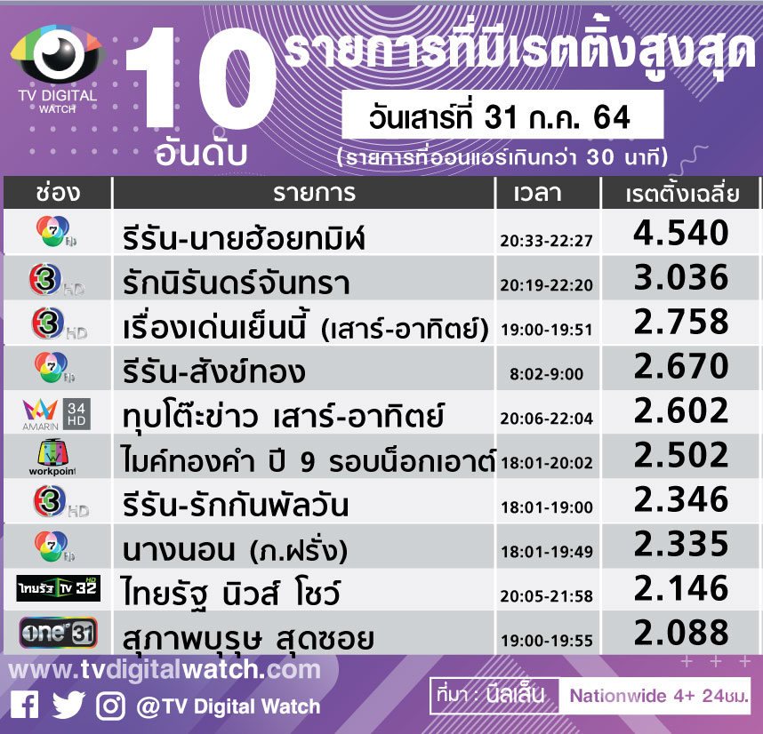 ช่อง 7 เป็นอันดับ 1 เช่นเดิม แต่เรตติ้งเฉลี่ยยังคงลดลงต่อเนื่องจนอยู่ห่างจาก ช่อง 3 อันดับ 2 ไม่มากเหมือนก่อน เรตติ้งเฉลี่ย 1.384 ลดลงจาก 1.464 ในสัปดาห์ก่อนหน้า รายการช่วงปลายสัปดาห์ มีรายการรีรันหลายรายการ ละคร “นายฮ้อยทมิฬ” เรตติ้ง 4.172 4.540 และ 4.332 ละครพื้นบ้านรีรัน “สังข์ทอง” 2.670 และ 2.319 “มาสเตอร์เชฟ เซเลบริตี้ ประเทศไทย” วันอาทิตย์ได้ 1.690