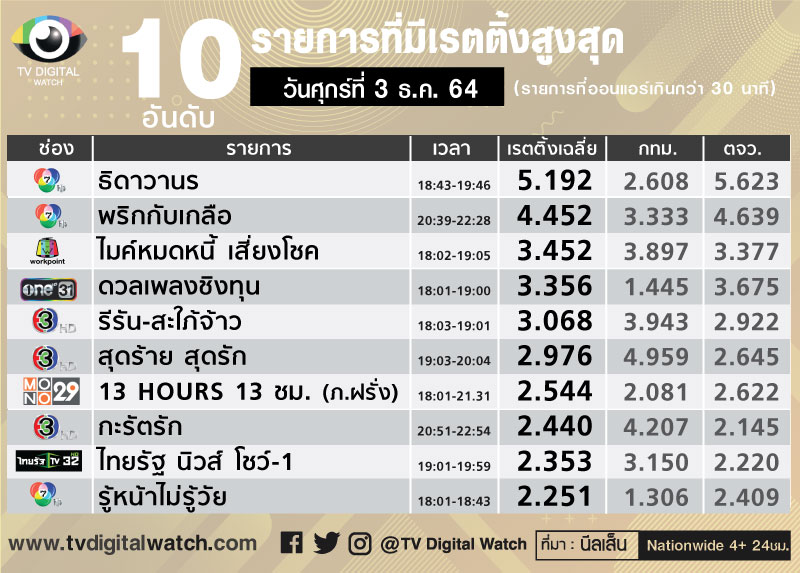 เรตติ้งช่องทีวีดิจิทัลประจำสัปดาห์ 29 พ.ย.-5 ธ.ค.64