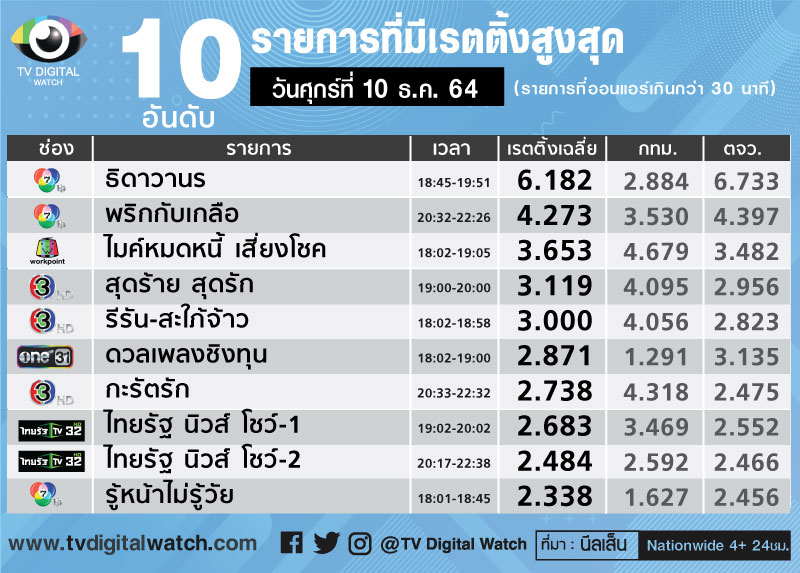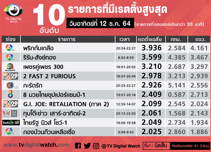 ภาพรวมเรตติ้งเฉลี่ยของช่อง 7 สัปดาห์นี้ได้ 1.485 สูงกว่าสัปดาห์ก่อนที่ได้ 1.467 อยู่อันดับ 1 อย่างมั่นคง ส่วนรายการช่วงปลายสัปดาห์ ละคร “พริกกับเกลือ” 4.273 3.359 และ 3.936 โดยมีละคร 1 ทุ่ม “ธิดาวานร”เป็นรายการเด่นทำเรตติ้งได้ดีต่อเนื่อง วันศุกร์ที่ 10 ธ.ค.เรตติ้ง 6.182