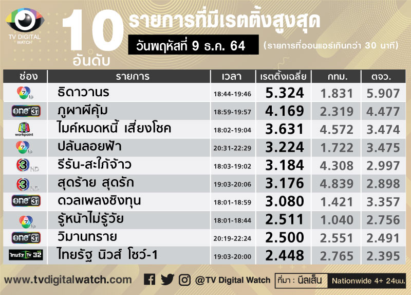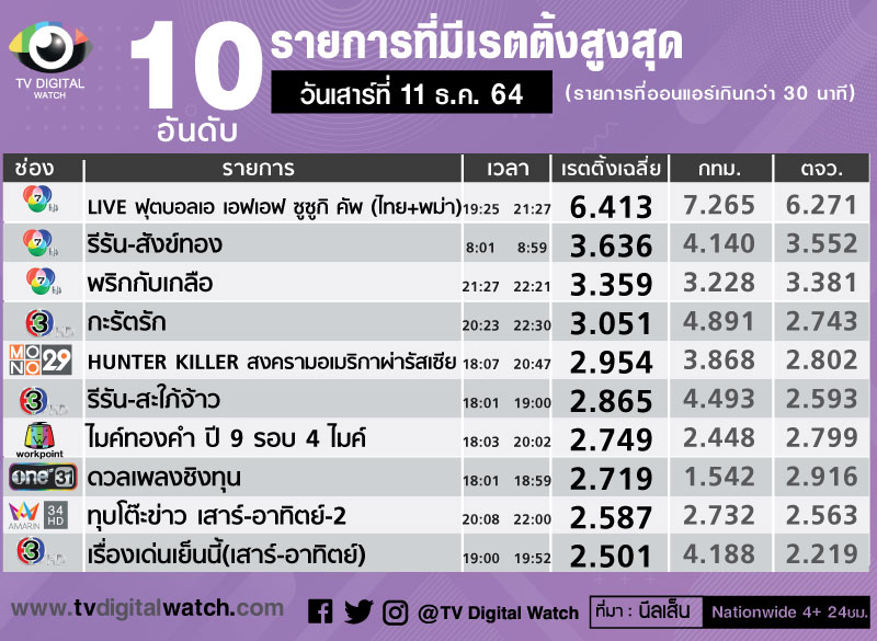 เรตติ้งประจำสัปดาห์ 6-12 ธ.ค. 2564 สัปดาห์นี้รายการเด่นที่สุดเป็นผลงานอันยอดเยี่ยมของทีมฟุตบอลชายทีมชาติไทยในศึก เอเอฟเอฟ ซูซูกิ คัพ วันเสาร์ที่ 11ธ.ค. เอาชนะเมียนมาร์ 4-0 เรตติ้งสูงสุดของสัปดาห์ เรตติ้ง 6.413 ถ่ายทอดสดทางช่อง 7