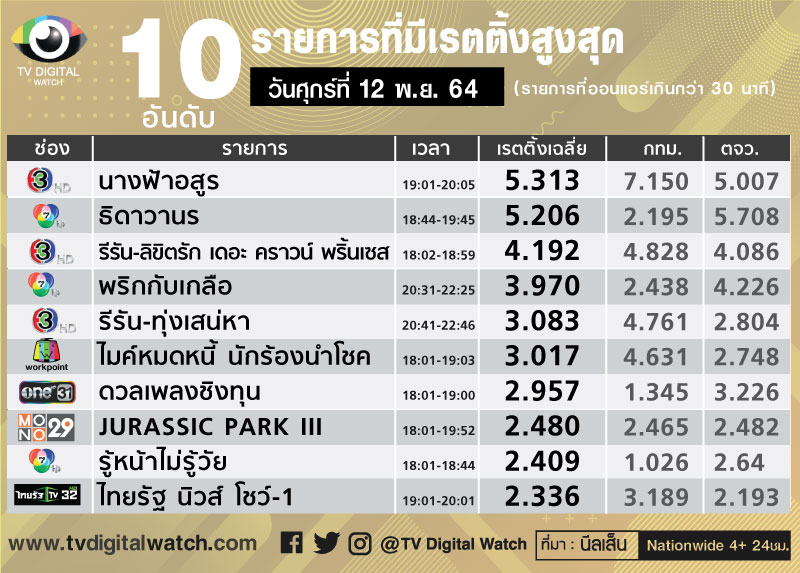 อันดับ 2 ช่อง 3 เรตติ้งดีขึ้นจาก 1.060 มาที่ 1.141 ผลงานเด่นมาจากละคร 1 ทุ่ม “นางฟ้าอสูร” เรตติ้งวันศุกร์ที่ 12 พ.ย.ได้ถึง 5.313 สูงกว่าละครคู่แข่งช่อง 7 “ธิดาวานร”เรตติ้ง 5.206 และละครรีรันไพรม์ไทม์ “ทุ่งเสน่หา” เรตติ้ง 3 วันได้ 3.083 3.437 และ 2.769 โดยวันเสาร์เรตติ้งสูงกว่าละคร “พริกกับเกลือ”ช่อง 7 ด้วย ส่วนรายการเกมโชว์เรตติ้งสูงสุดของช่อง “ฮอลลีวูด เกมไนท์” เรตติ้ง 1.872 นอกจากนี้ละครรีรัน 6 โมงเย็น “ลิขิตรัก The Crown Princess” ใกล้จบแล้ว ยังทำเรตติ้งได้ดีต่อเนื่องด้วย วันศุกร์ 12 พ.ย.เรตติ้งสูงถึง 4.192