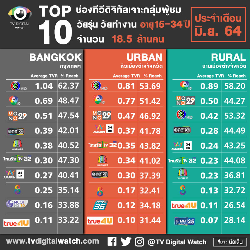 2. TOP10 ช่องทีวีดิจิทัล เจาะกลุ่มผู้ชมวัยรุ่น วัยทำงาน อายุ 15-34 ปี จำนวน 18.5 ล้านคน แยกพื้นที่กรุงเทพ URBAN และ RURAL