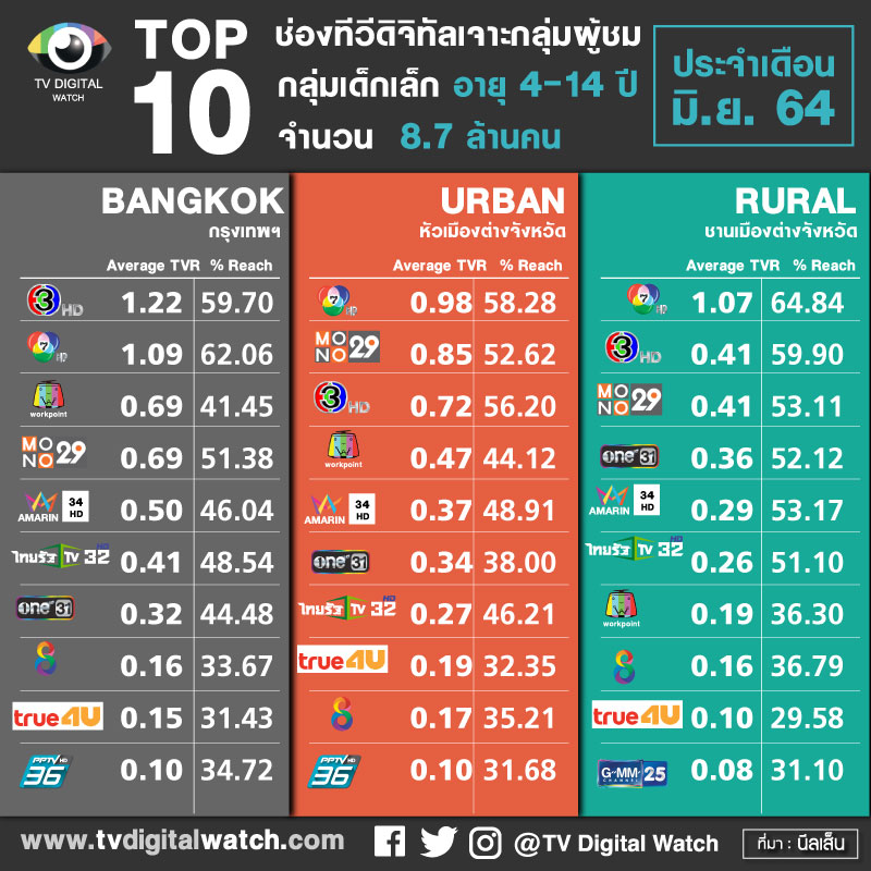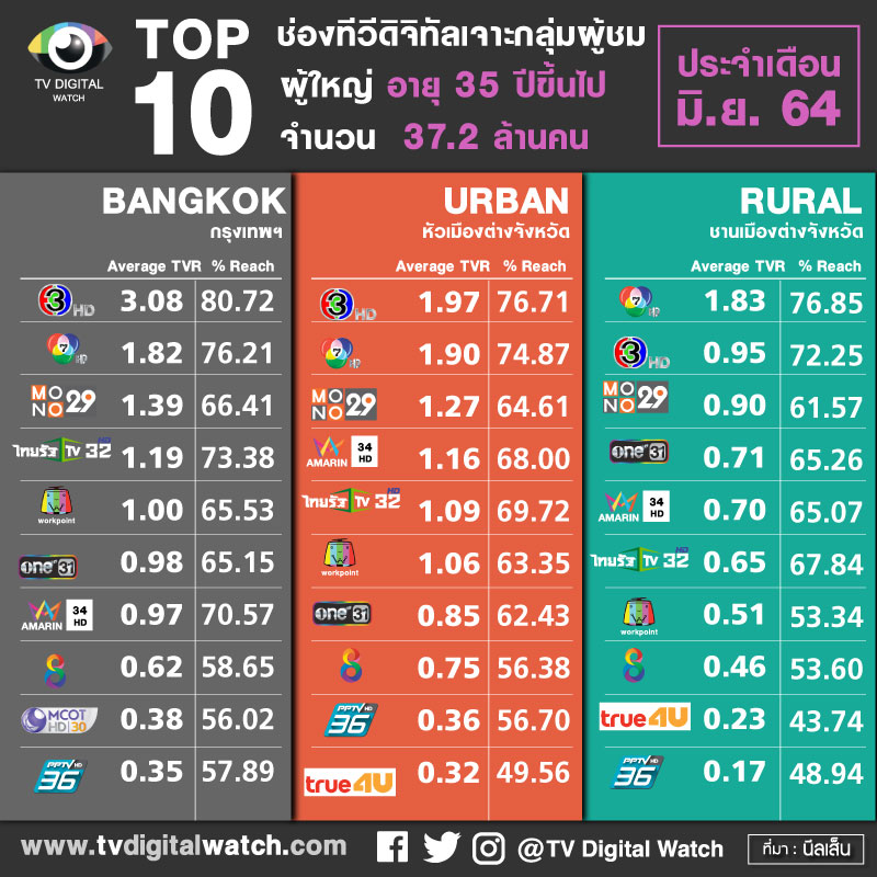 1 . TOP10 ช่องทีวีดิจิทัล เจาะกลุ่มผู้ชมผู้ใหญ่ อายุ 35 ปีขึ้นไป จำนวน 37.2 ล้านคน แยกพื้นที่กรุงเทพ URBAN และ RURAL