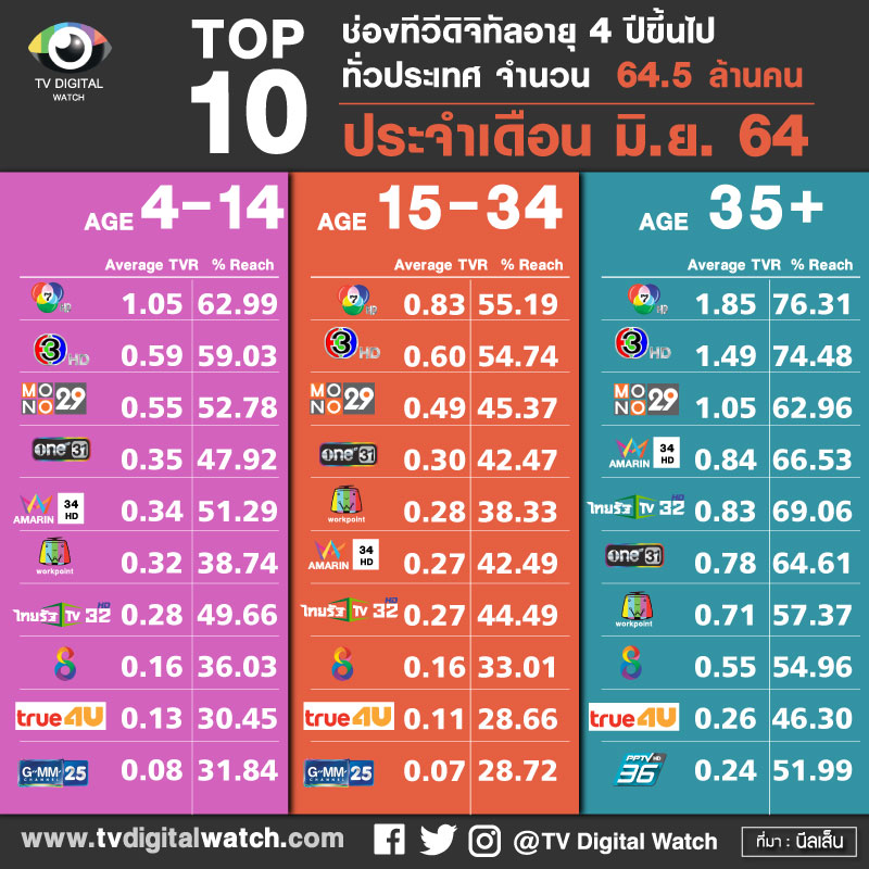 4. TOP 10 ช่องทีวีดิจิทัลอายุ 4 ปีขึ้นไปทั่วประเทศ จำนวน 64.5 ล้านคน แยกเป็น TOP10 เรตติ้งเฉลี่ยทั่วประเทศกลุ่มอายุ 4-14 ปี กลุ่ม 15-34 ปี และกลุ่ม 35 ปีขึ้นไป