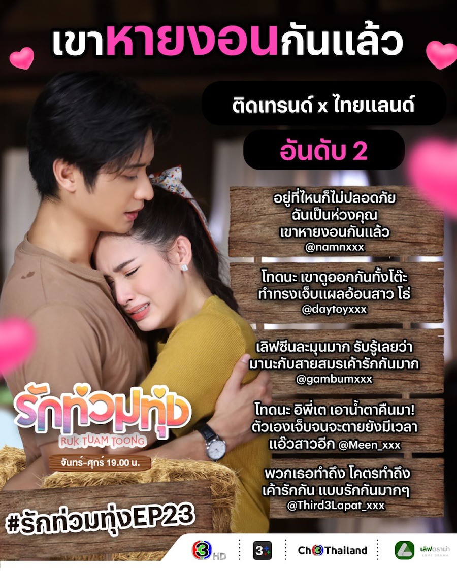 ในระหว่างที่ “เรือนทาส” กำลังเดือด ฟากละครเย็นฟีลกู๊ด “รักท่วมทุ่ง” ก็ไม่น้อยหน้า ยิ่งเข้าใกล้ตอนจบยิ่งปัง! ทำทุกคนติดละครงอมแงม พากันลุ้นกับเหตุการณ์ความวุ่นวายต่าง ๆ ที่เกิดขึ้นในทุ่งตาลโตนดว่าจะคลี่คลายอย่างไร? ล่าสุดความสัมพันธ์ของคู่ มานะ (ออกัส วชิรวิชญ์) และ สายสมร (น้ำฟ้า ธัญญภัสร์) ก็เหมือนทุกอย่างจะลงเอยด้วยดี แต่สายสมรดันได้โอกาสเป็นนางเอกรักท่วมทุ่ง ซึ่งเป็นความฝันที่เธอรอมาทั้งชีวิต ด้าน เตมร (มีน นิชคุณ) ก็ได้ลุกขึ้นสู้เพื่อปกป้องน้องสาว ด้วยเสน่ห์ความอบอุ่นตรงนี้แหละที่ทำสาว ๆ คลั่งรัก “มีน นิชคุณ” หนักมาก เท่านั้นยังไม่พอเมื่อเตมรตามง้อสาวอย่าง มารศรี (แพรวา ณิชาภัทร) ก็ยิ่งทำคนดูลุ้นความรักคู่นี้เช่นเดียวกับคู่มานะสายสมร จน “รักท่วมทุ่งEP.23” กวาดเรตติ้งปังสนั่นจอ เรตติ้งกลุ่มผู้ชมกรุงเทพฯ ทุบสถิติได้ 6.69 เรตติ้งกลุ่มผู้ชมอายุ 15  ปี ขึ้นไป หรือ กลุ่ม 15 BU+ (Bangkok and Urban) ทะยานสูงถึง 5.63 และเรตติ้งรวมทั่วประเทศ (NATIONWIDE) คว้าไปได้ 4.87 แถมกระแสละครยังคงครองเทรนด์ X อันดับท็อป ๆ ต่อเนื่อง