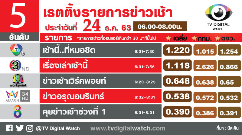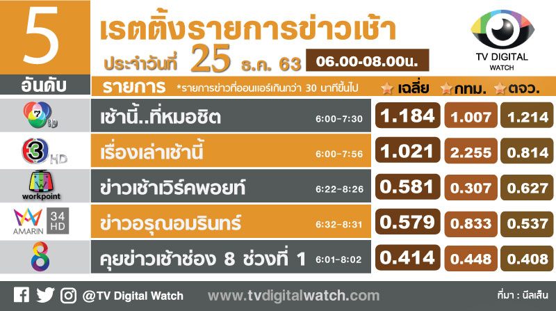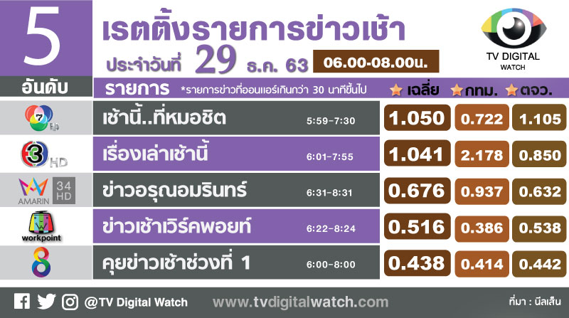 สำหรับรายการข่าวเช้าในช่วงเวลาเดียวกันที่ติดกลุ่ม TOP5 ของแต่ละวันนั้น พบว่าอันดับ 3-5 เป็นของช่องเวิร์คพอยท์ ช่องอมรินทร์ทีวี และช่อง 8 โดยที่อันดับ 3-4 เป็นการช่วงชิงกันระหว่าง “ข่าวเช้าเวิร์คพอยท์” และ “ข่าวอรุณอมรินทร์” มีเรตติ้งเฉลี่ยใกล้เคียงกัน สลับกันนำ และตาม เรตติ้งเฉลี่ยอยู่ระหว่าง 0.5-0.6