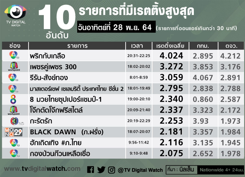 เรตติ้งประจำสัปดาห์ 22-28 พ.ย.2564 สัปดาห์นี้ช่องส่วนใหญ่เรตติ้งเฉลี่ยลดลง มี 7 ช่องเรตติ้งดีขึ้น ที่เรตติ้งดีขึ้นชัดเจนได้แก่ช่อง 7 สัปดาห์ที่ผ่านมานี้ เริ่มต้นละครชุดใหม่ช่วงไพรม์ไทม์แทนที่ละครรีรันในผังรายการของช่อง 7 ถึง 2 เรื่อง และละคร 1 ทุ่ม “ธิดาวานร” เรตติ้งเพิ่มขึ้นเรื่อยๆ ล่าสุดวันศุกร์ที่ 26 พ.ย.เรตติ้ง 6.213 มีส่วนทำให้เรตติ้งเฉลี่ยของช่องเพิ่มจาก 1.478 มาที่ 1.517
