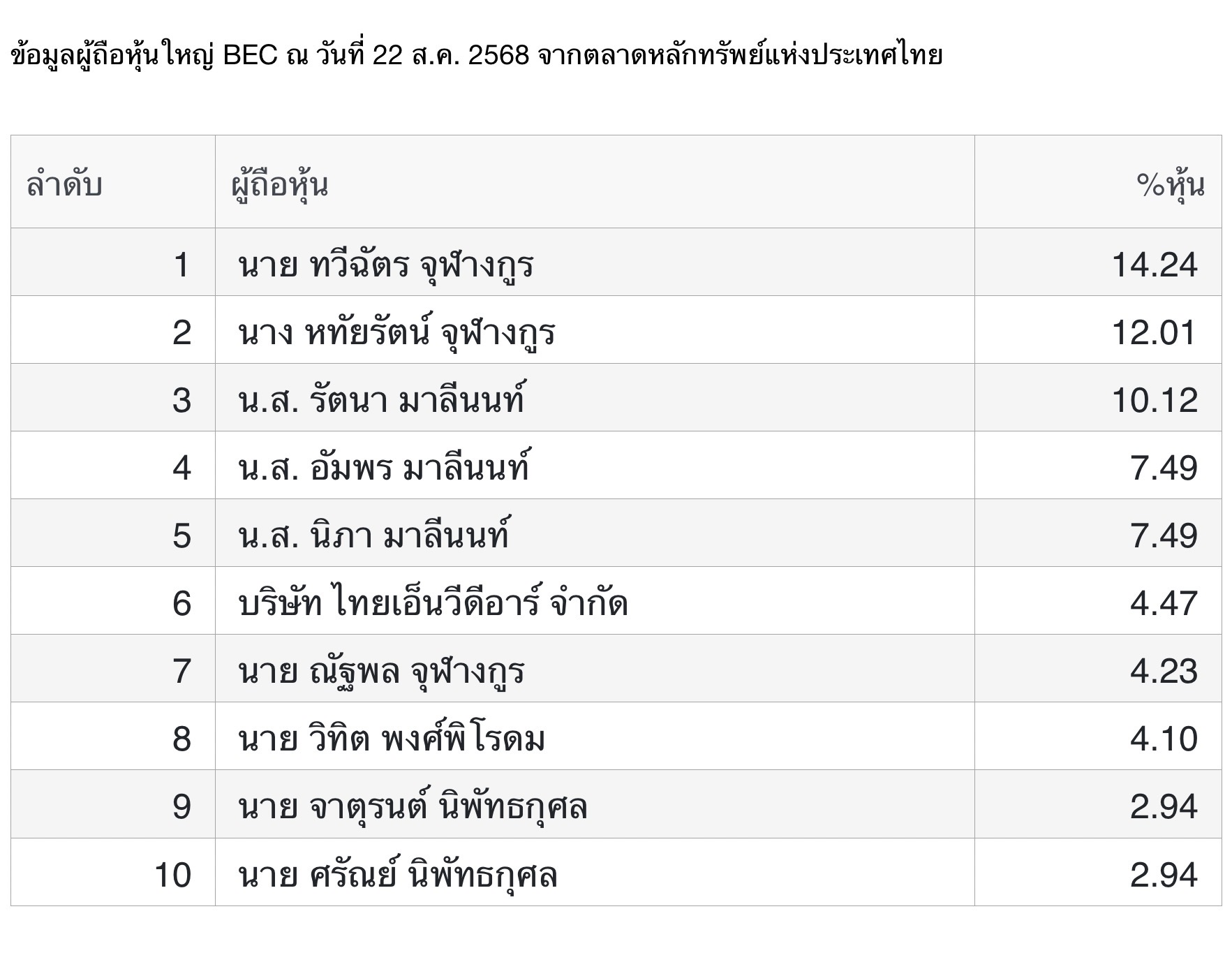 เปิดรายชื่อผู้ถือหุ้นใหญ่ 10 อันดับแรกในช่องวัน (ONEE) และช่อง 3 (BEC) ในปี 2568 ที่ผ่านมาแล้ว แน่นอนว่าทั้งสองช่องยังคงมีรายชื่อที่เป็นเจ้าของเดิมผู้ก่อตั้งช่องในอดีตถือหุ้นใหญ่ แต่ก็มีคนใหม่เข้ามาถือหุ้นอยู่ด้วยพักใหญ่แล้ว