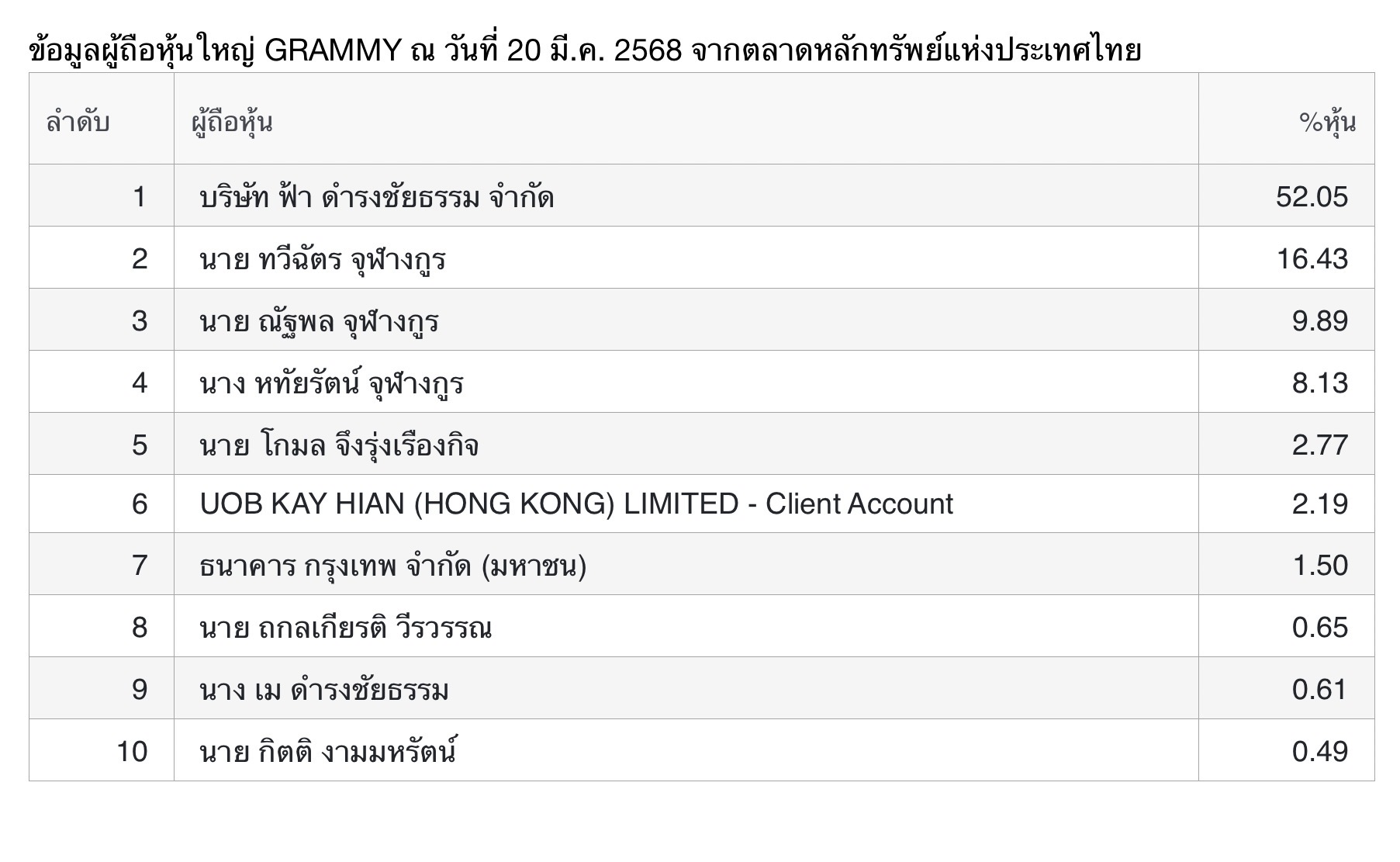 จากข้อมูลในตลาดหลักทรัพย์แห่งประเทศไทย ที่รายงานภาพรวมผู้ถือหุ้นใหญ่ของทั้งสองช่องเมื่อเดือนสิงหาคม 2568 ที่ผ่านมาพบว่า มีสมาชิกครอบครัวจุฬางกูร ถือหุ้นในช่อง 3 (บมจ.บีอีซี เวิลด์ ) , ช่องวัน (บมจ.เดอะวัน เอ็นเตอร์ไพรส์) รวมที่ถือหุ้นในจีเอ็มเอ็ม แกรมมี่ ซึ่งเป็นผู้ถือหุ้นใหญ่ในช่องวัน ดัโดยช่อง 3 มีสมาชิกจุฬางกูร 3 คน ถือหุ้นใหญ่รวม 30.48% โดยมีทวีฉัตรถือหุ้นมากที่สุด 14.24%, หทัยรัตน์ ถือหุ้น 12.01% และ ณัฐพล ถือหุ้น 4.23%