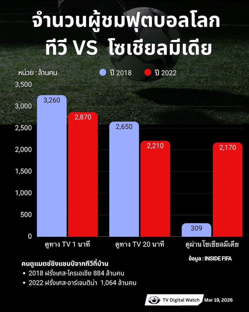 สำหรับรายละเอียดสถิติเกี่ยวกับจำนวนผู้ชมถ่ายทอดสดฟุตบอลโลกที่ผ่านมาปี 2018 และ 2022 มีดังนี้