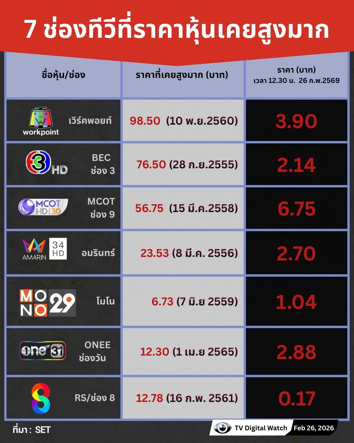 เวิร์คพอยท์ (WORK) จากบริษัทผู้ผลิตที่โดดเด่นด้านรายการวาไรตี้ บันเทิง เกมโชว์ มาเป็นเจ้าของช่องทีวีดิจิทัลช่อง 23 เท่าที่พบข้อมูลราคาหุ้นสูงสุดเคยไปถึง 98.50 บาท เมื่อวันที่ 10 พ.ย. 2560 มาในปี 2569 วันนี้วันที่ 26 ก.พ. ปิดตลาดครึ่งวันราคาอยู่ที่ 3.90 บาท