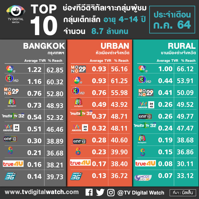 1.  TOP10 ช่องทีวีดิจิทัล เจาะกลุ่มผู้ชมผู้ใหญ่ อายุ 35 ปีขึ้นไป จำนวน 37.2 ล้านคน  แยกพื้นที่กรุงเทพ URBAN และ RURAL