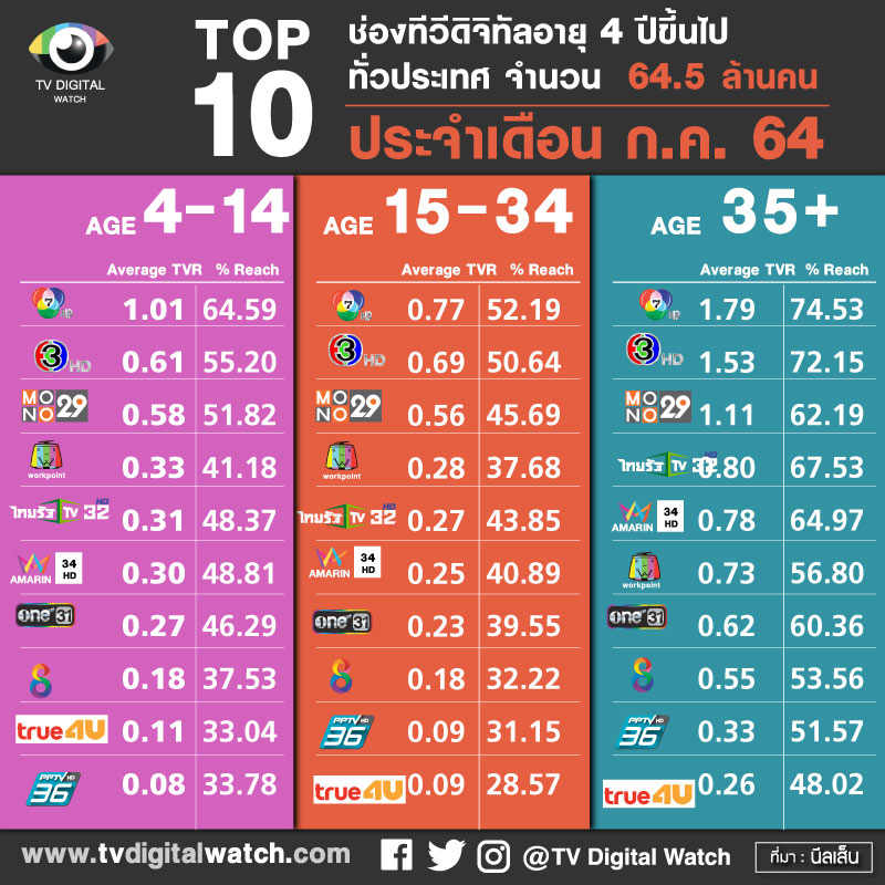 4. TOP10 ช่องทีวีดิจิทัลอายุ 4 ปีขึ้นไปทั่วประเทศ จำนวน 64.5 ล้านคน  แยกเป็น TOP10 เรตติ้งเฉลี่ยทั่วประเทศกลุ่มอายุ 4-14 ปี  กลุ่ม 15-34 ปี และกลุ่ม 35 ปีขึ้นไป